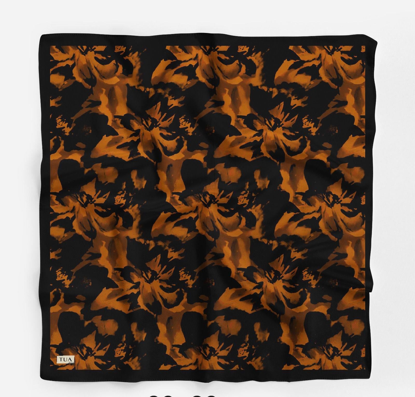 Edles Quadrat-Tuch mit abstraktem Print in Gold, Orangerot, Lila, Braun & Schwarz. Ein luxuriöser Blickfang, der jedes Outfit aufwertet.